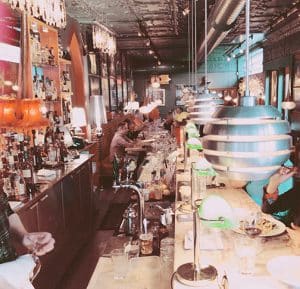 Formerly a convenience store, the space was gutted except for the patterned tin ceiling. The attention to detail gives the dining rooms a timeless eclectic vibe. Think bordello chic with cozy banquettes, a crescent shaped bar, exposed brick, sexy lighting via red feathered lamps and a myriad of gold, silver and crystal chandeliers. Every seat offers a different view.