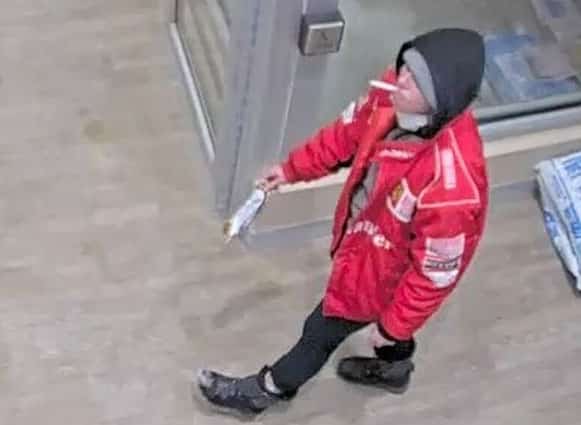 Police said the man was wearing “a white surgical mask, black toque, grey hoody, red winter jacket with a Ferrari symbol on the back, dark blue or black pants, and dark grey and black boots.”