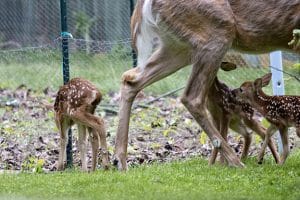 Erle was already looking out through the front door, and we watched the mom and fawns come out. First came the doe, then the two stronger fawns, and finally the tiniest, and constantly bleating, third. They were no more than an hour and a half old at this point and would only weigh around four pounds. Disney sure did a great job when they animated Bambi’s wobbly legs.
