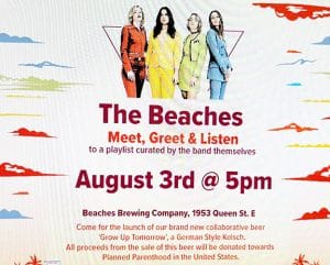 Local band The Beaches will be holding a meet-and-greet with fans on Queen Street East today to launch a collaborative beer brand which will help raise funds for Planned Parenthood in the United States.
