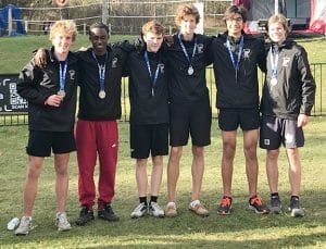 From left: Ewen Fraser, Fitz Williams, Dylan Welch, Jamie Parkin, Ilex Machado and Noah McPherson celebrate their silver medal at the OFSAA cross country championships in Uxbridge on Nov. 5. Photo: Submitted.