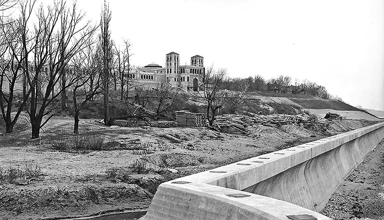 Photo above, the R. C. Harris Water Treatment Plant during construction work in 1935. Inset photo, the same view now.