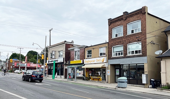 The site is currently composed of 14 properties (low-rise residential and mixed-use buildings) which have a total of 24 rental dwelling units. The specific building addresses identified in the application are 1291-1311 Gerrard St. E. and 243-247 Greenwood Ave. The proposal does not include the building situated directly on the southeast corner of the intersection.