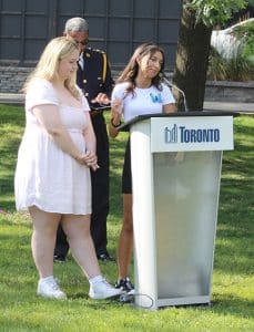 Noor Samiei, accompanied by Samantha Price, speaks at the memorial service marking the fifth anniversary of the Danforth Shooting. Photo by Alan Shackleton.