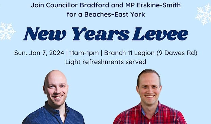 Local residents will have a chance to meet with their councillor and MP on Sunday, Jan. 7, as Beaches-East York Councillor Brad Bradford and Beaches-East York MP Nathaniel Erskine-Smith host a New Year’s Levee at Royal Canadian Legion Branch 11, 9 Dawes Rd., from 11 a.m. to 1 p.m.