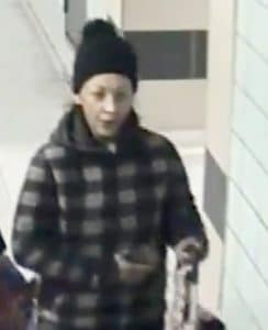 The woman is described as five-feet, nine-inches tall with a medium build, missing teeth, long black hair in a ponytail sticking out of her hat. She has a septum ring and dermal piercing on the cheekbone, and was wearing a checkered black and grey sweater, slush pants, black shoes, and was pulling a personal shopping cart.