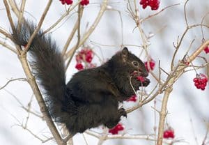 A black squirrel is shown eating berries in this photo. Photo by Ann Brokelman.