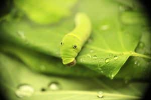 An Eastern Tiger Wwallowtail caterpillar eats a tulip tree leaf. Photo by Ann Brokelman.