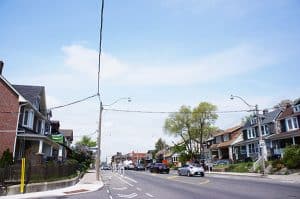 This image shows the view looking north along Woodbine Avenue towards Danforth Avenue as it now looks. Image created by Adam Smith.