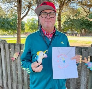 Paul Belyea with one of the many cards he received last Friday. This card recognized the squeaky toy that he carries with him to brighten the day of the students crossing at the intersection of Queen Street East and Elmer Avenue. Photo by Alan Shackleton.