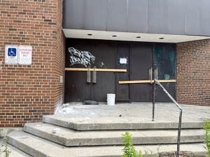 The secured doors of the now vacant St. Catherine of Siena Catholic Church on Danforth Avenue are shown in this Beach Metro Community News photo taken on July 9.