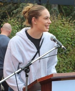 Penny Oleksiak speaks at a fundraiser for the Daily Bread Food Bank in Kew Gardens park in this Beach Metro Community News file photo.