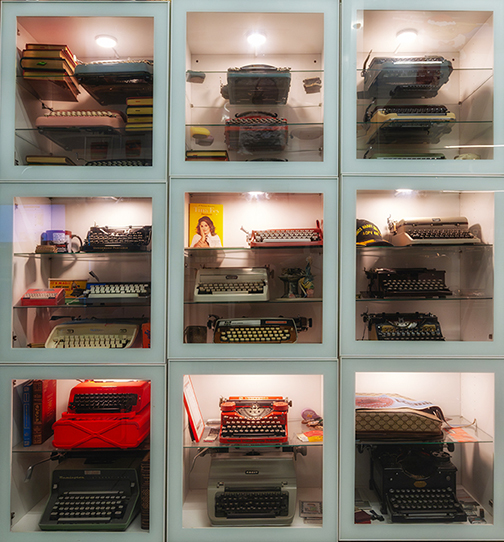 The shop boasts a cornucopia of typewriter-themed merchandise: tiny candles molded into Underwood typewriters, a “Praise the Word” typewriter mug imprinted with typewriter letters, a typewriter post-it notes dispenser complete with a “Pull Me” tab. Perched above a display case is a framed picture of an orange typewriter sandwiched between two red ones.