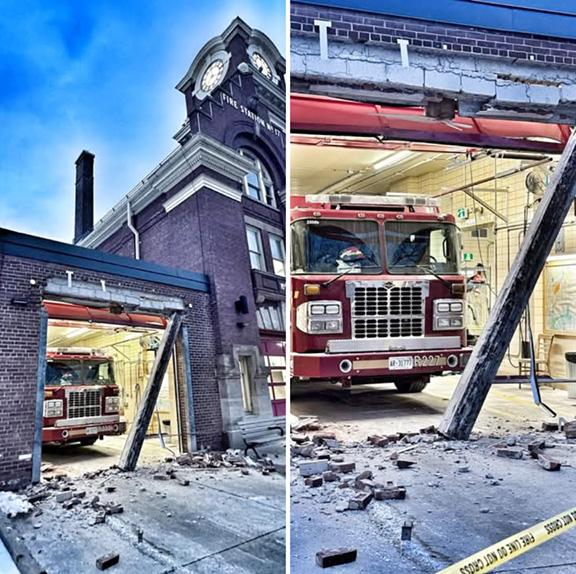 This time around, residents made Beach Metro Community News aware that the same set of bay doors on Station 227’s west side were damaged once again in an apparent incident on Wednesday, Jan. 29, involving a Toronto Fire Services vehicle. There also appeared to be damaged brick work above the doors.