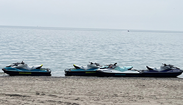 At issue is the apparent renting of the jet skis taking place mostly at the far west end of Woodbine Beach by Ashbridges Bay Park, just past the line that separates the beach’s swimming zone from its (water) craft zone.