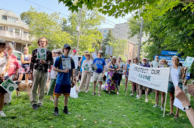 Speeches were made at the Kingston Road entrance to the ravine, and a table was also set up for those wishing to sign a petition regarding their concern about the impact of the proposed 11-storey building.