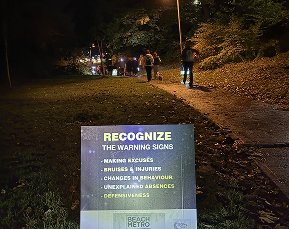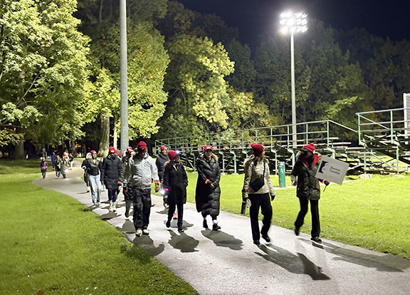 Participants in the Thursday, Oct. 23, event embarked on a three-kilometre walk throughout Beach streets and along the Boardwalk wearing red hats and flashing red lights to support mothers and children seeking refuge from domestic violence.