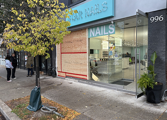 The boarded up window of Star Nails & Spa on Kingston Road is shown in this photo from the morning of Thursday, Oct. 30. Photo by Matthew Stephens.