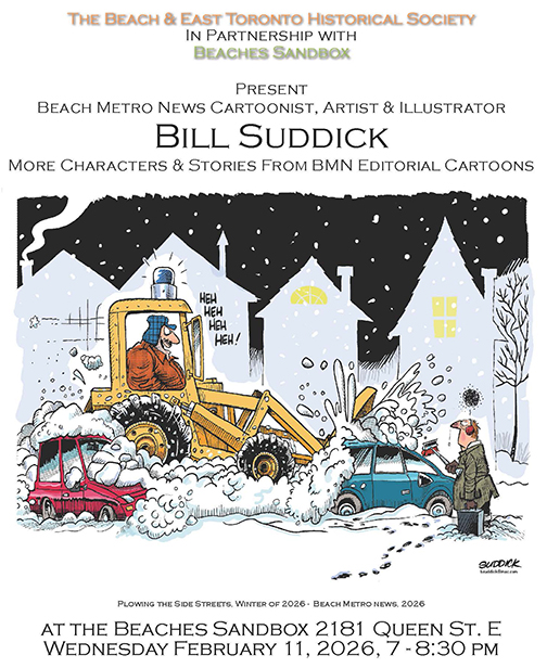 Beach Metro Community News editorial cartoonist Bill Suddick will be the guest speaker at The Beach and East Toronto Historical Society’s next event on the evening of Wednesday, Feb. 11.
