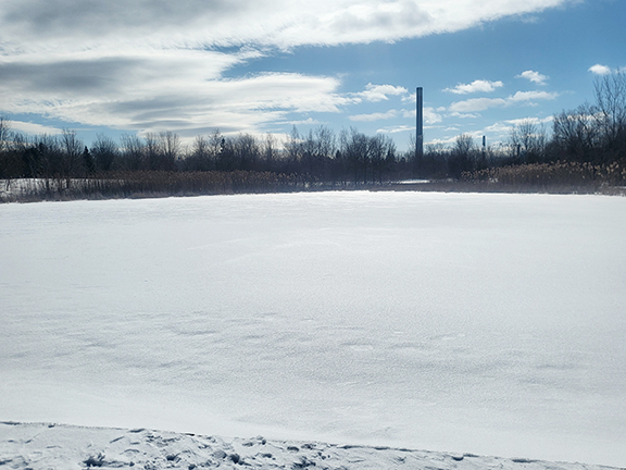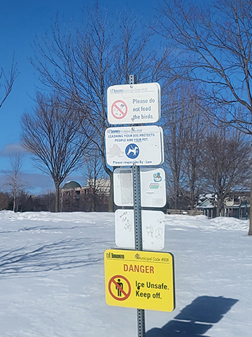 In Woodbine Park the pond with the fountain could be mistaken for a snow-covered field. Even with the signs up, people have walked on the ice.