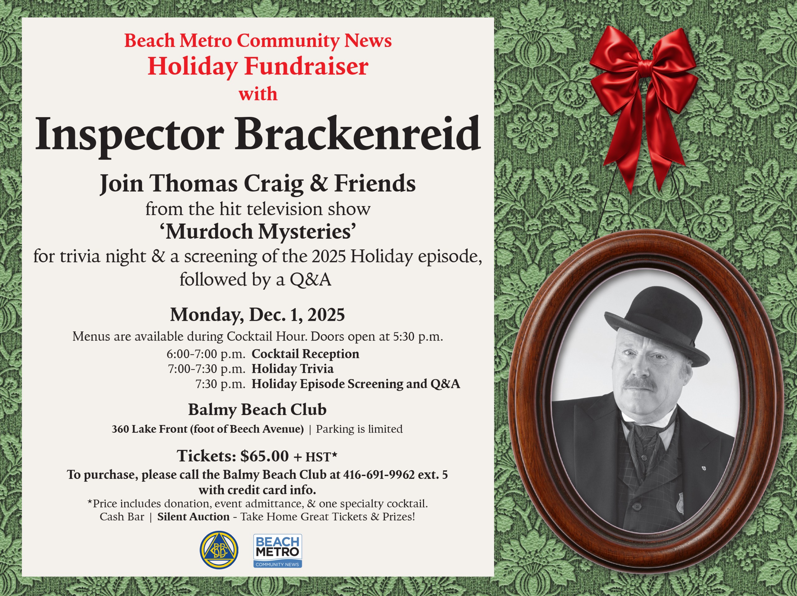 Join Thomas Craig and Friends from ‘Murdoch Mysteries’ for a screening of the 2025 Holiday episode. Evening includes cocktail reception, holiday trivia, silent auction, cash bar, and screening followed by Q&A. Tickets $65 + HST, available from the Balmy Beach Club, 416-691-9962 x 5.