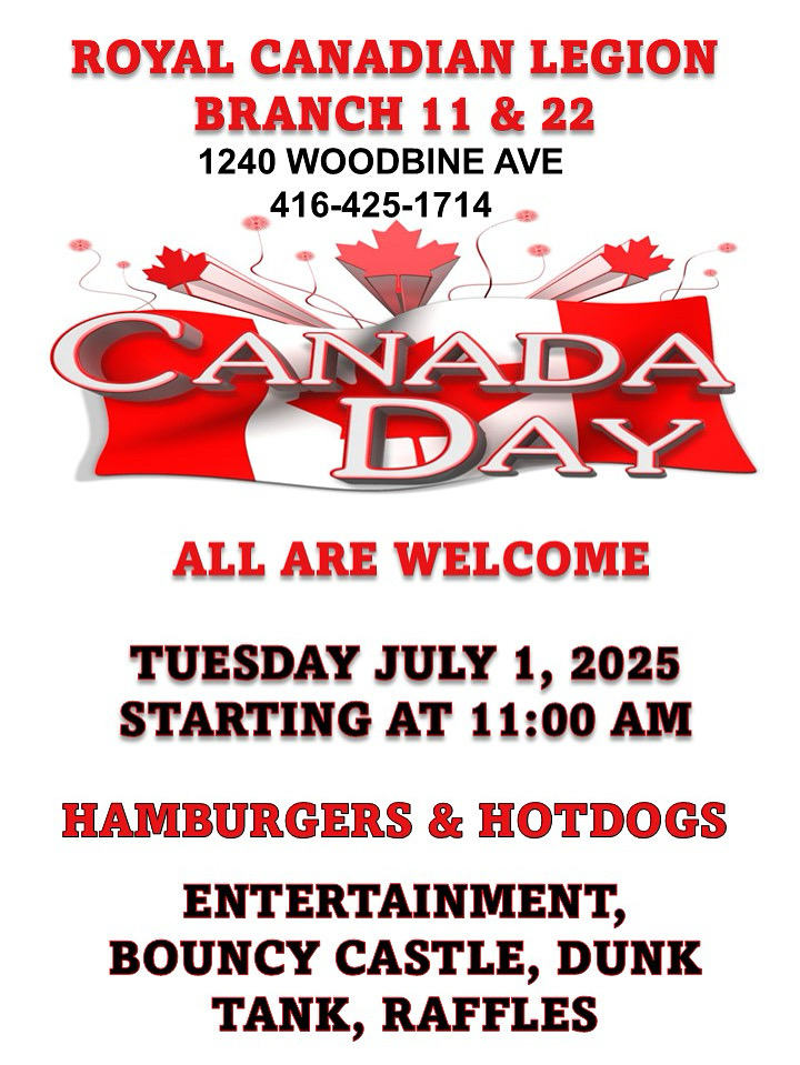 Canada Day Community Event at the Royal Canadian Legion Branch 22, 1240 Woodbine Ave.