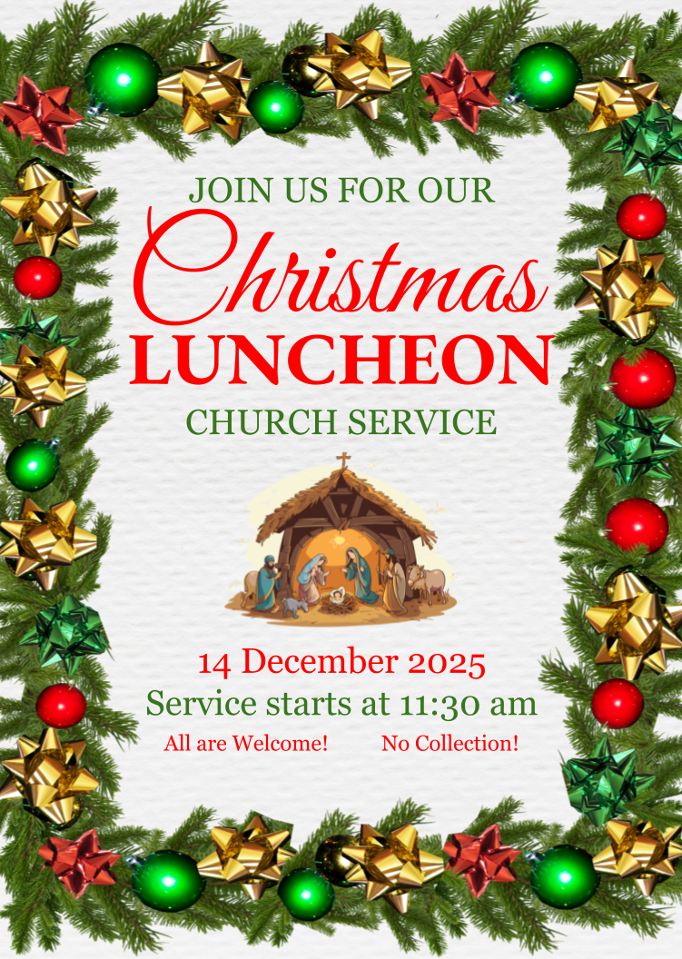 A time of singing carols and hearing a Christmas message followed by a free community Christmas luncheon.