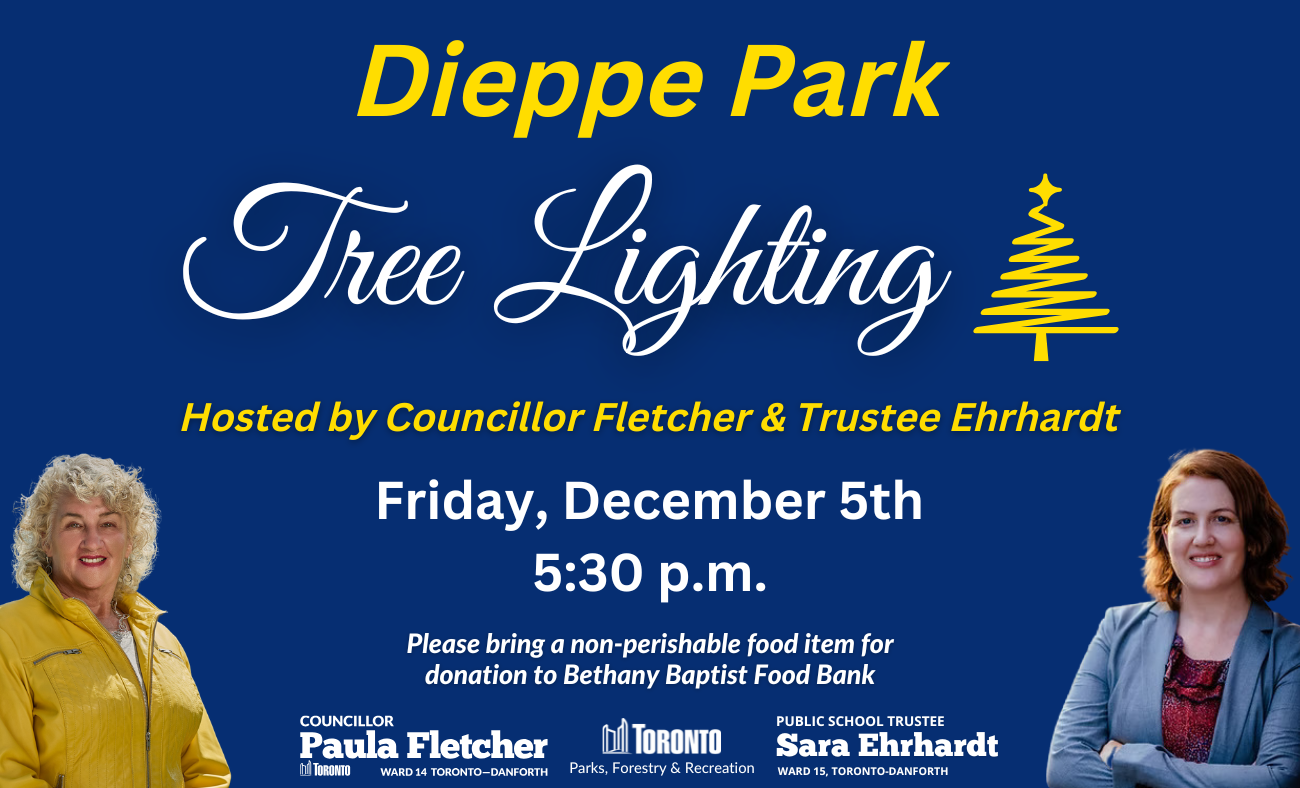 Join Councillor Paula Fletcher and Public School Trustee Sara Ehrhardt for the Dieppe Park Tree Lighting Ceremony on Friday, December 5th, starting at 5:30 p.m.
