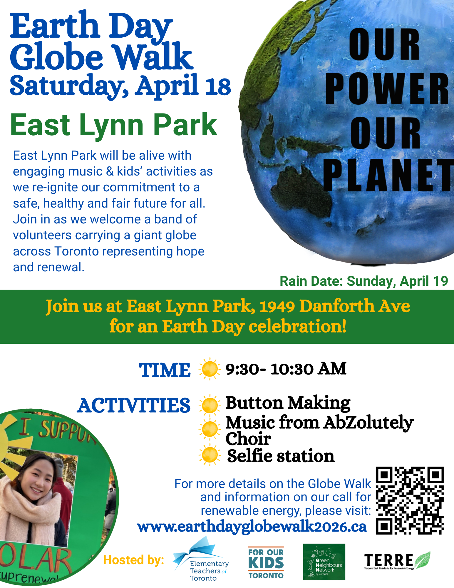 Join in to welcome volunteers carrying a giant globe across Toronto representing hope and renewal. Event also includes button making, music, and a selfie station. Rain date is April 19. Info: www.earthdayglobewalk2026.ca