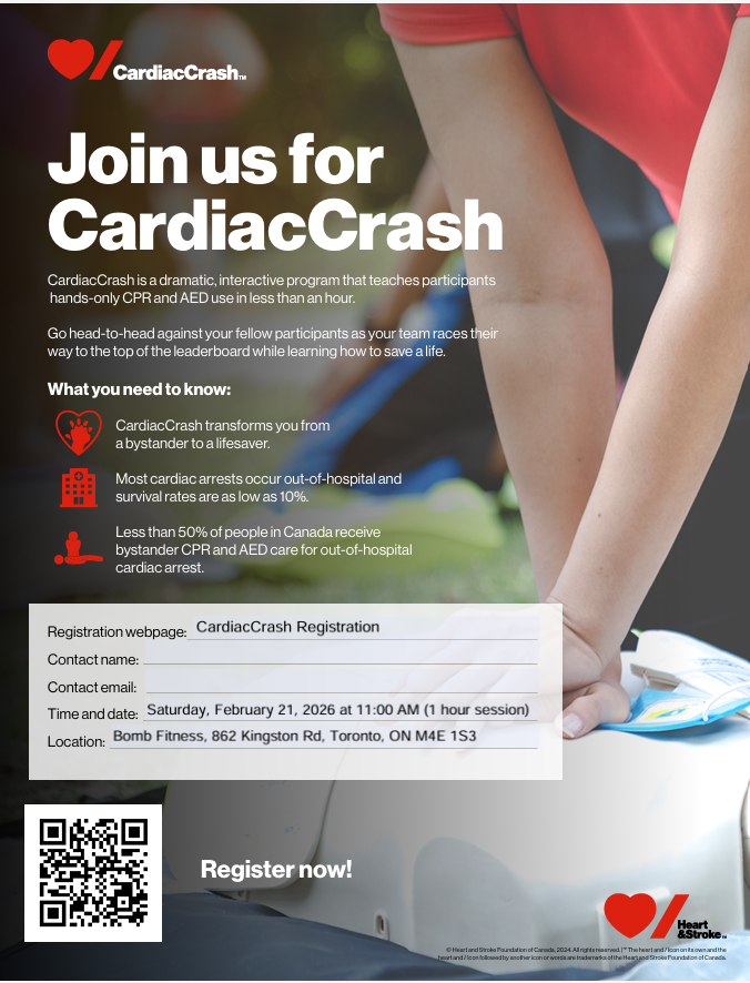 This is why BOMB Fitness, in collaboration with CARE (Cardiac Arrest Response & Education) is participating in CardiacCrash, a dramatic, interactive program from Heart & Stroke that teaches participants hand-only CPR and AED use in less than an hour! CardiacCrash transforms you from bystander to lifesaver.