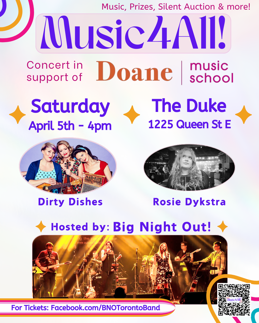 Come to Music4All! this Saturday, April 5th to raise funds for Doane Music School, one of Canada’s largest children’s music charities. This charity provides subsidized music lessons to students throughout the city including hundreds of east end children. There will be live music performances including DMS alumna Rosie Dykstra, Rootsy trio “Dirty Dishes” and popular Toronto dance cover band “Big Night Out!” with remarks from Juno Award winner and DMS founder Melanie Doane.