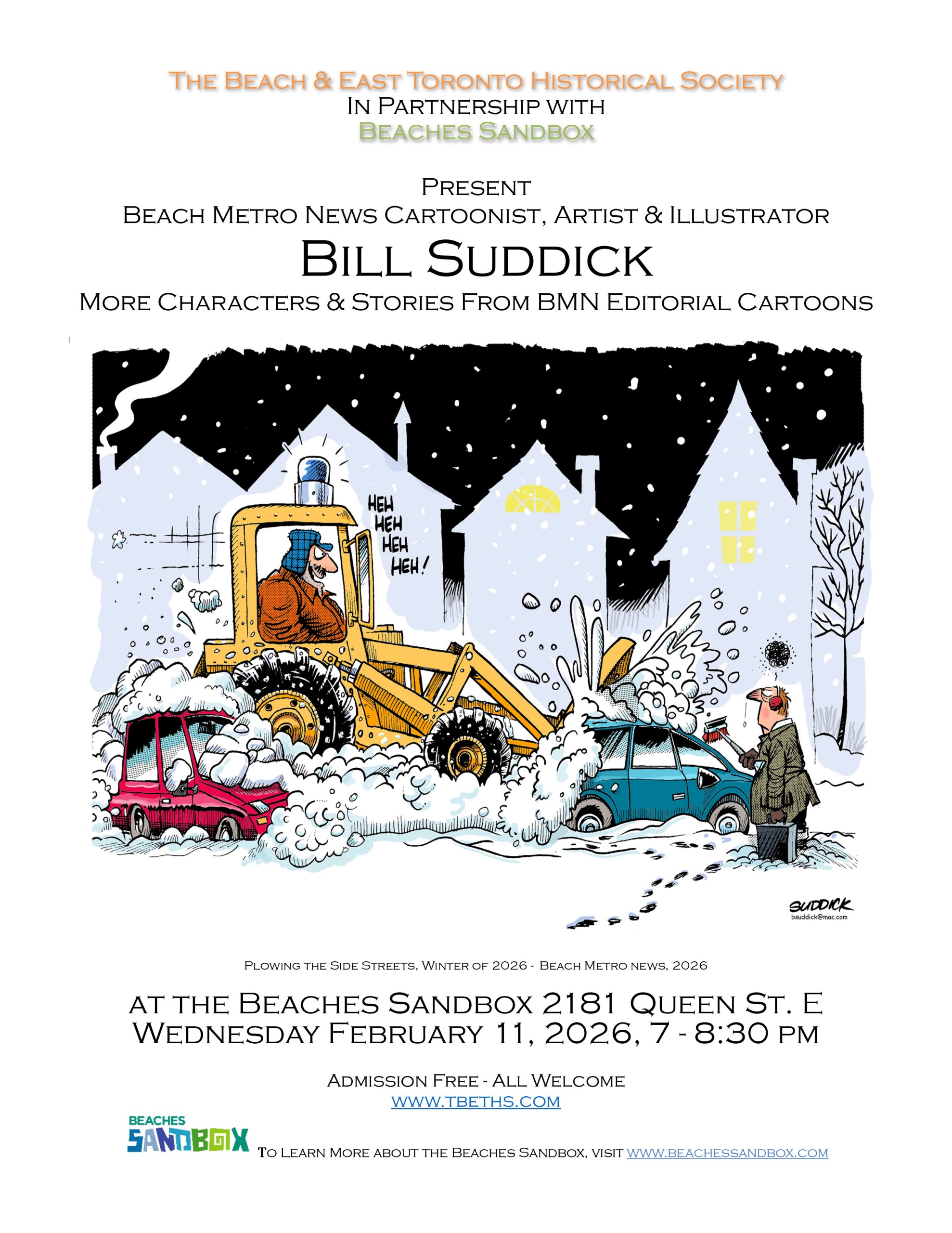Feb. 11: The Beach and East Toronto Historical Society (TBETHS) presents Beach Metro News Cartoonist and Author Bill Suddick at The Beaches Sandbox, 2181 Queen St. E., 7-8:30 p.m. Suddick will share anecdotes and show examples of his work. Copies of Bill’s book will be available for purchase at the event. Admission is free. Info: www.tbeths.com