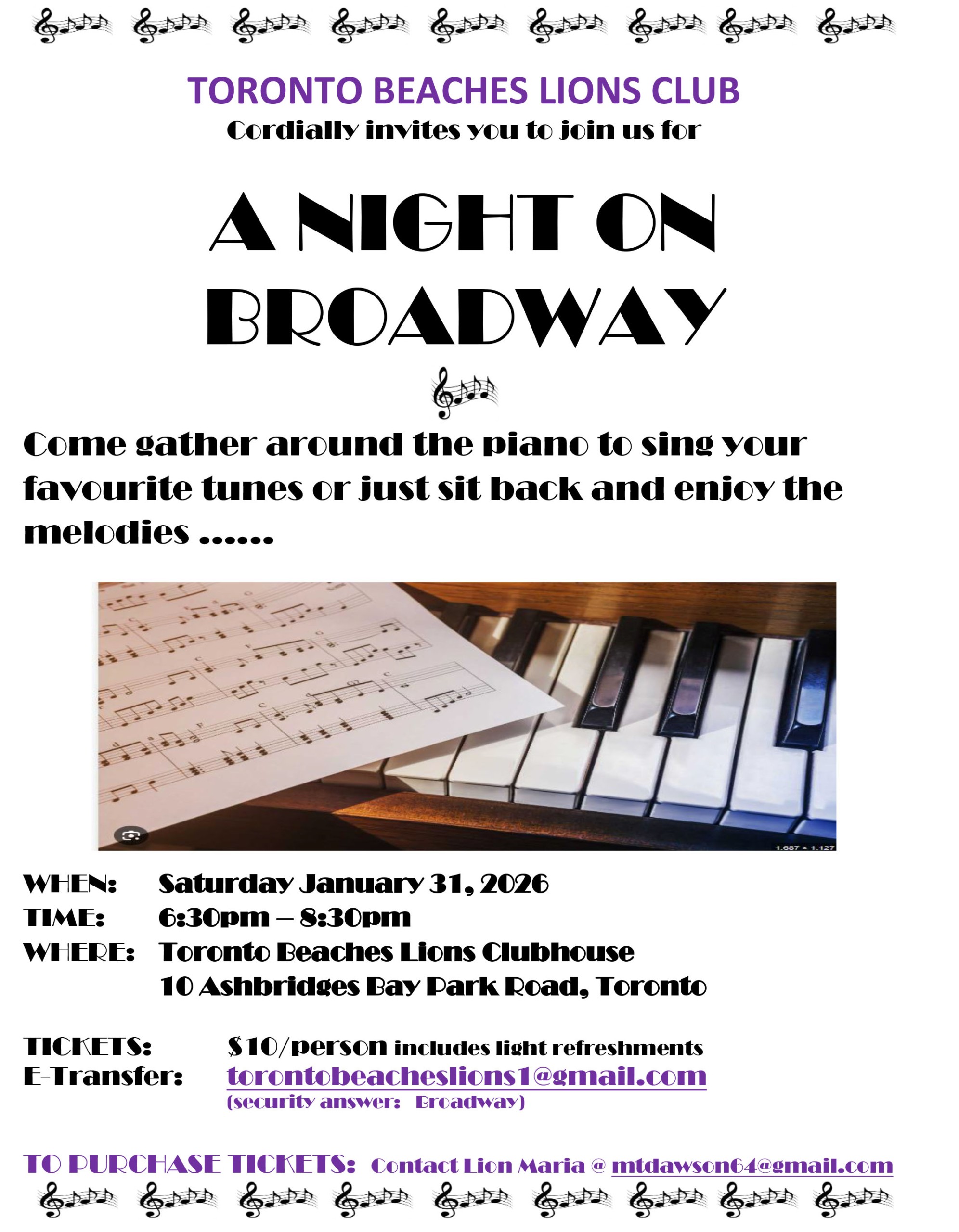 Toronto Beaches Lions Club invites you to A Night on Broadway. Gather around the piano to sing and enjoy your favourite tunes. Tickets are $10 per person and include light […]