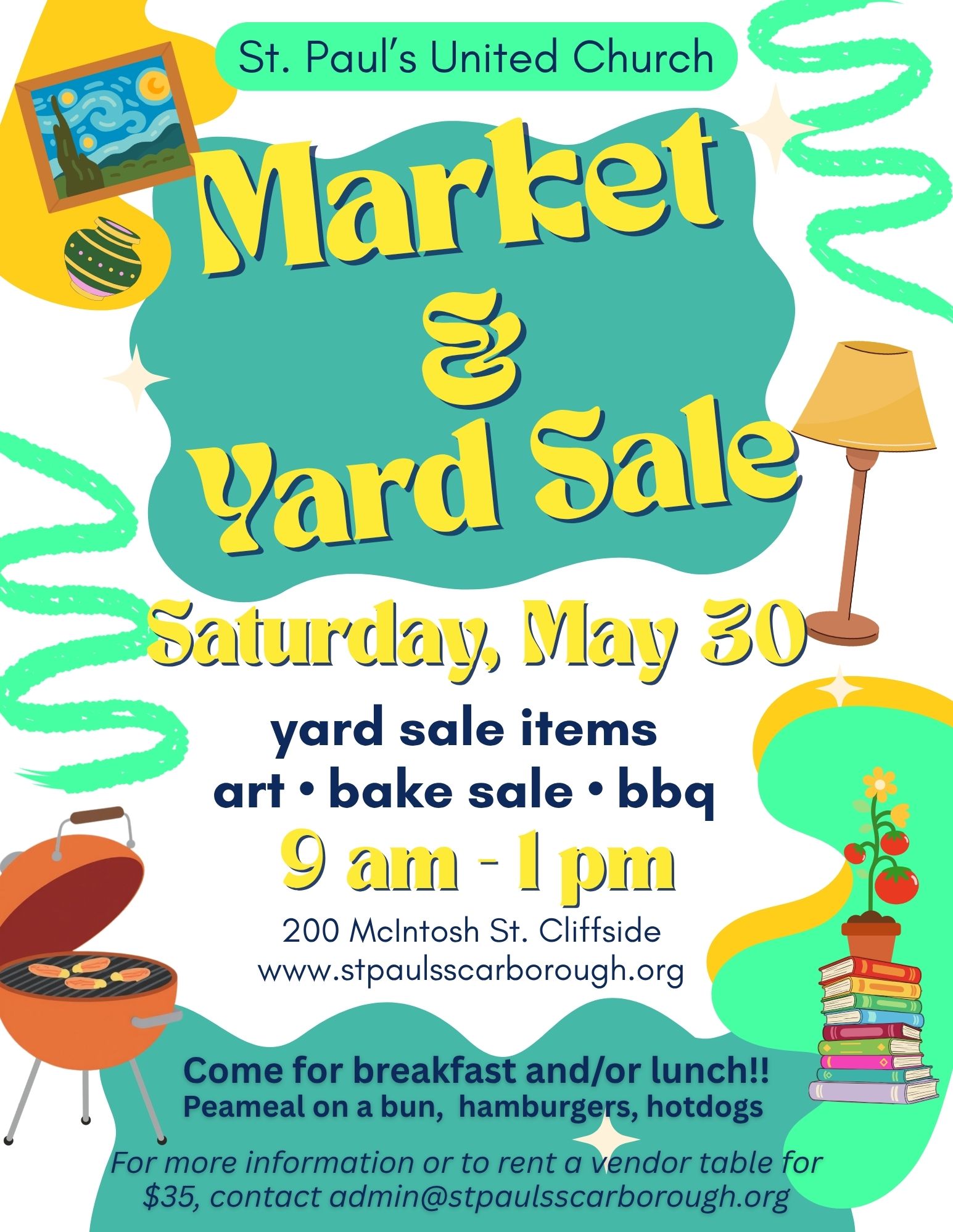 Yard sale items, artisan vendors, BBQ, Bake Table. Do you have stuff to sell? Vendor tables are available to rent for $35.00.