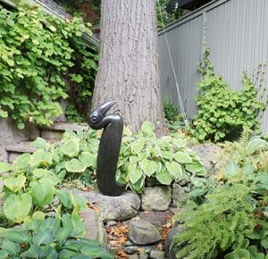 This private area is home to several pieces of art chosen by the gardener’s husband, including a sleek black sculpted bird and a collection of masks decorating the outdoor dining room that’s in use every summer evening.
